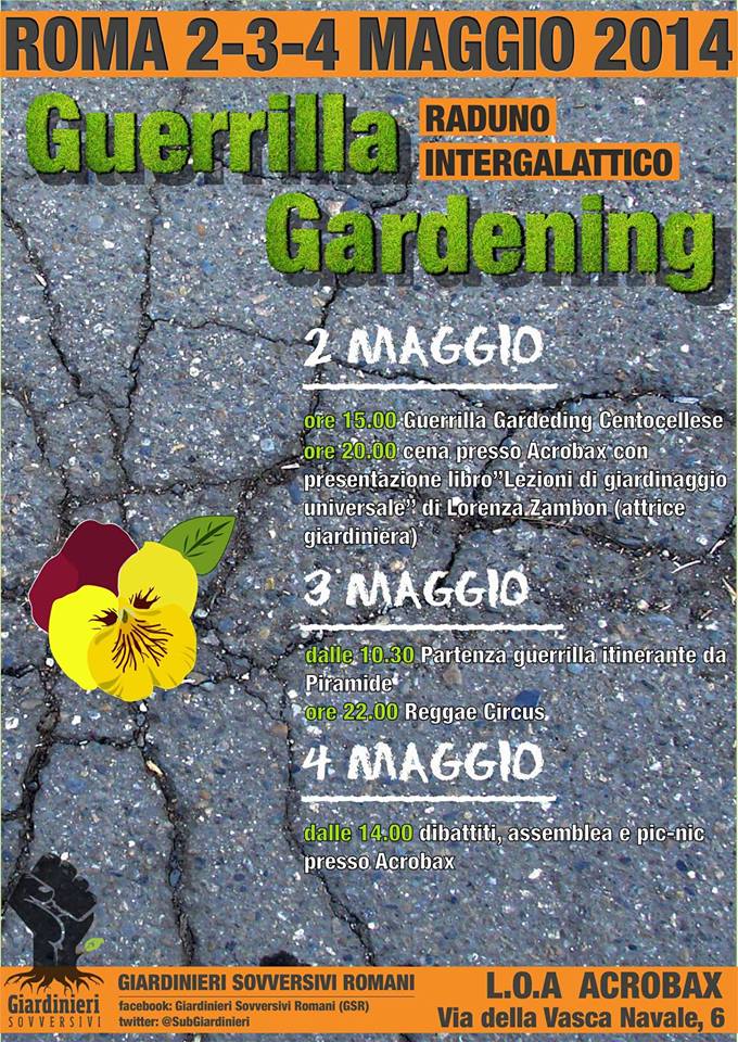 Roma è pronta ad ospitare il raduno nazionale (anzi, intergalattico!) di guerrilla gardening. Una fantastica tre giorni, da venerdì 2 a domenica 4 maggio 2014, durante la quale confluiranno nella capitale i gruppi di guerrilla gardening provenienti da tutta Italia. Il primo raduno nazionale si è tenuto nel 2013 a Bologna ed terminato dopo due giorni di guerrilla con una bella e partecipata assemblea che ha visto votare per il 2014 Roma come sede del secondo raduno.