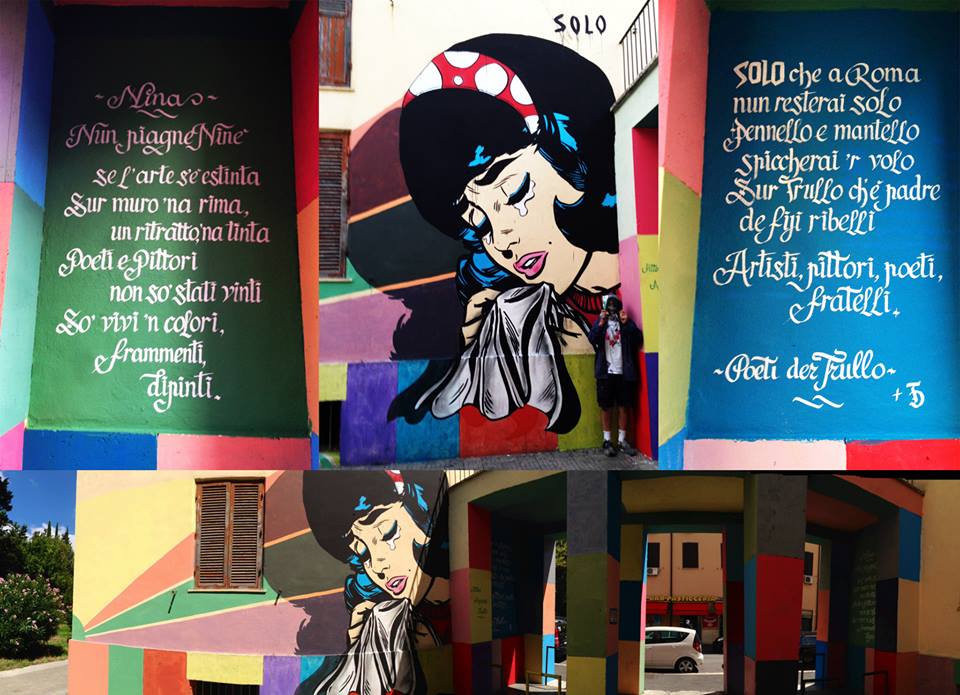 Questo progetto ha un nome ed è NINA. Nina è stata ideata e realizzata dallo street artist Solo, dai Pittori Anonimi Trullo e da noi PdT. I Pittori hanno colorato in modalità cubo-di-rubik la Porta di BrandeTrullo, sostenendo con raggi di colore Nina Piangente. Solo ha passato ore su una scala di altezza indefinita con pennello in mano per darle forma, colore, vita. Il calligrafo Daniele Tozzi [https://www.behance.net/danieletozzi] ha prestato la sua abile mano ai nostri versi. Noi abbiamo dedicato a Ninetta una poesia. Ringraziamo tutti i residenti, anziani, genitori, ragazzini che passando ci hanno sostenuto. Ringraziamo Andrea di Trasformazioniurbane per la compagnia evergreen. L’opera si trova tra Via Massa Marittima e Via del Trullo, angolo con Via Sarzana. E non è la prima, e non sarà l’ultima.