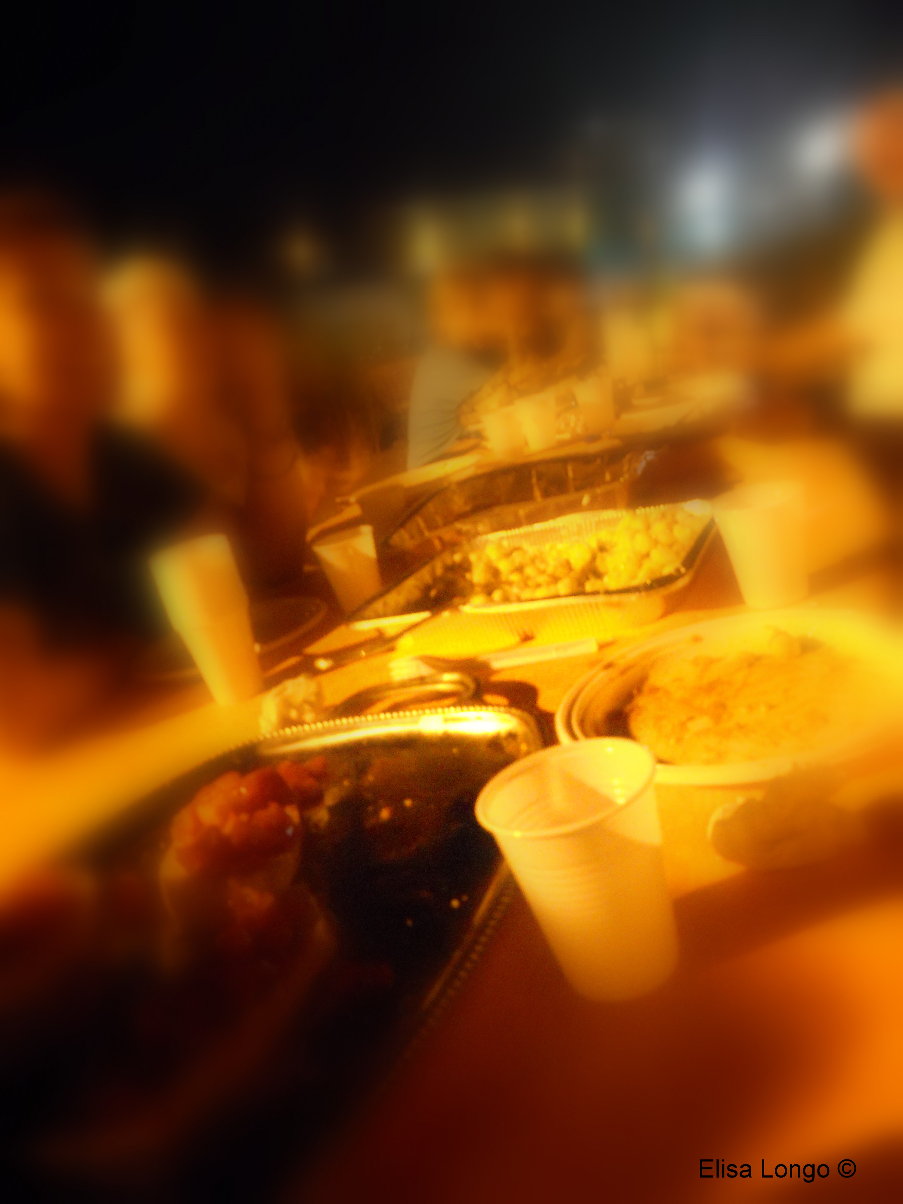 Condivisione: all’esterno, un tavolo lungo e adibito per la cena (le foto sono volontariamente sfuocate per tutelare la riservatezza dei pittori)