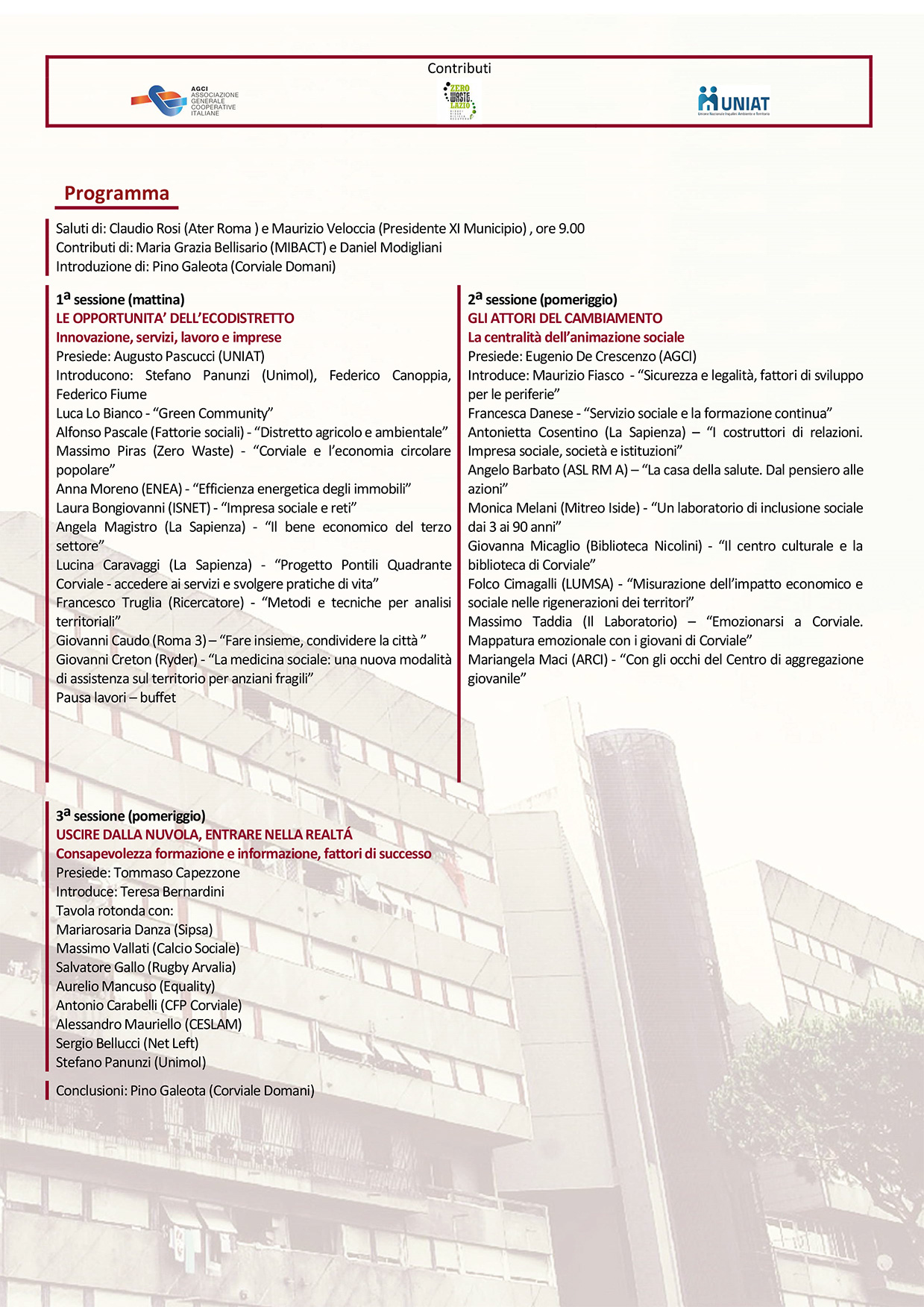 Interviene Capezzone che propone a Gallo e Antonio Carabelli di studiare una collaborazione per attivare percorsi comuni d’impegno nello sport usando i rispettivi spazi. Lamenta inoltre una scarsa diffusione all’esterno di queste due importanti attività di Corviale e chiede a Antonio Carabelli di fornirgli qualche nominativo di chi segue i corsi di web per coinvolgerli nella redazione di cronache degli incontri di rugby.