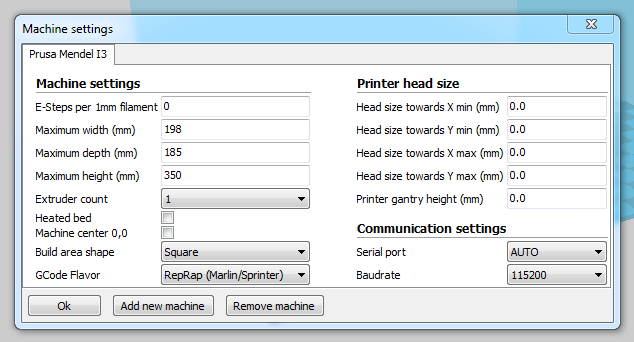 Una volta installato ed avviato Cura ( lo potete scaricare gratuitamente a questo link), dovremmo settare il software in modo da farlo comunicare con la nostra stampante. Per far ciò andremo nel menu “Machine->Machine settings.. “
