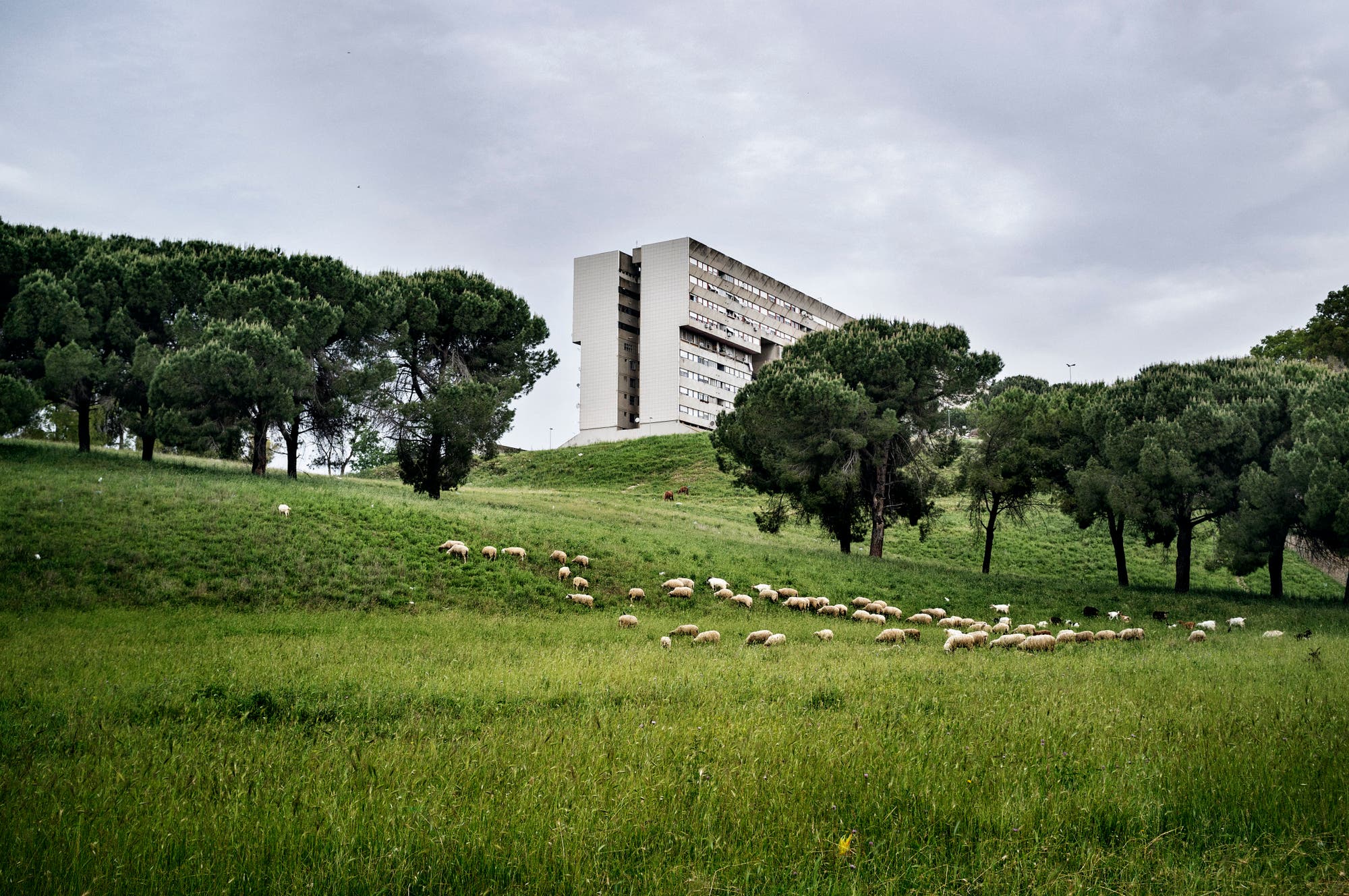 Se vedi il Corviale di fronte a te per la prima volta, ti toglie il respiro. Con una lunghezza di un chilometro, l’edificio di nove piani è il grattacielo più lungo d’Europa. Il mostro di cemento fu costruito negli anni settanta sul bordo sud-occidentale di Roma, secondo la tradizione delle macchine abitative utopiche di Le Corbusier. Contrariamente ad altri edifici sociali del suo tempo, non si trova nella periferia urbana densamente popolata, ma nel mezzo di un idillio verde. Nei pini di fronte al blocco gigante i grilli cinguettano. Le balle di fieno si trovano sui campi circostanti. All’ombra di un cipresso, i cavalli pascolano.