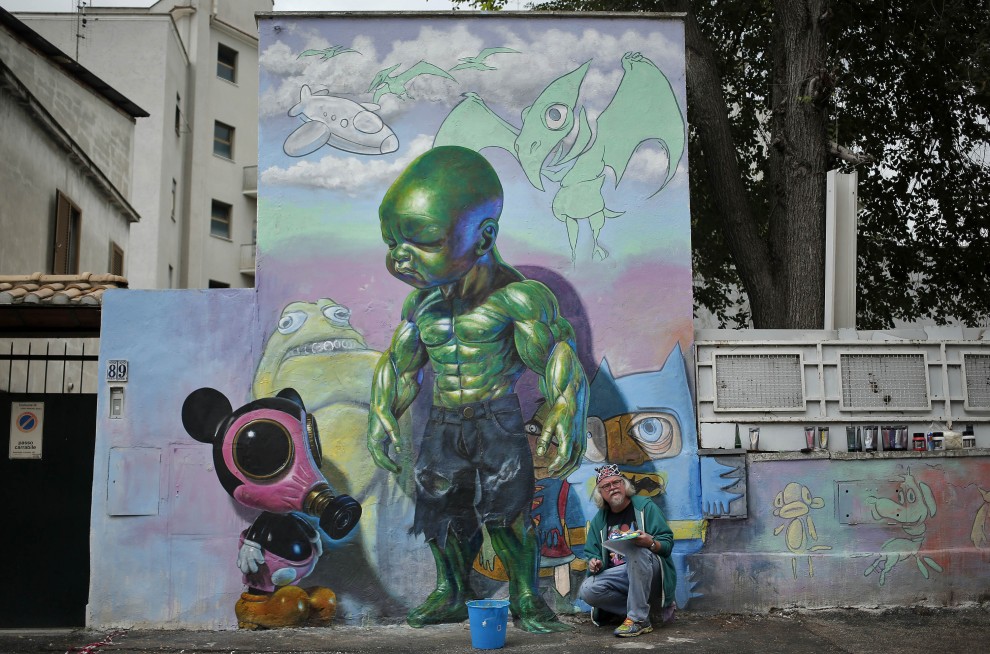Un baby Hulk al Quadraro. Dopo aver passato Guernica “ai raggi X”, rivisitandola tre anni fa in un’installazione all’ex Mattatoio di Testaccio, Ron English è tornato a dipingere a Roma. Questa volta per il M. U. Ro, il museo di urban art a cielo aperto del Quadraro, dove l’artista americano, fra i principali esponenti del surrealismo pop, ieri ha terminato il suo ultimo lavoro. Per il muro di via dei Pisoni, English ha scelto come protagonista The Temper Tot, lo stesso Hulk bambino dipinto un anno fa a Little Italy. “È una figura che unisce in sé forza e immaturità, come un bimbo di due anni. Può rappresentare il contrasto fra un Paese molto potente, con un forte esercito, ma con una leadership immatura”. Accanto a lui, fra supereroi e cartoni rivisitati, l’inquietante Mickey Mouse con la maschera antigas. Uno dei “target” più ricorrenti nelle opere di English, che fin dagli albori della sua carriera ha preso di mira multinazionali del tabacco, giganti dei fast food (sua la mascotte obesa del cibo spazzatura MC Supersized, usata per il documentario “Super Size Me”) e simboli della pubblicità, reinterpretati in modo spesso dissacrante. Ma che ha anche saputo creare vere e proprie icone contemporanee, come nel caso di “Abraham Obama”, la celebre immagine in cui i volti dei due presidenti americani – Obama e Lincoln – si sovrappongono, realizzata per la campagna 2008.