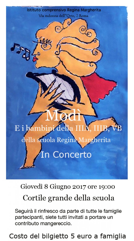 In occasione della fine dell’anno scolastico, l’I.C. Regina Margherita sarà coinvolto con la partecipazione delle classi VB, IIIA, IIIB ad un concerto musicale dove gli alunni delle suddette classi si esibiranno nel coro per accompagnare l’artista Giuseppe Chimenti, in arte Modì.