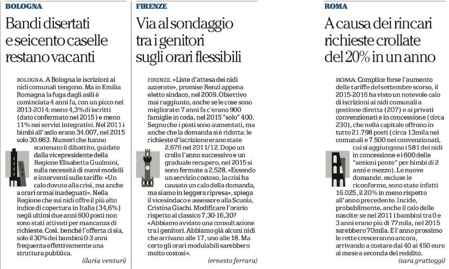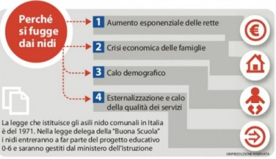 Complice forse l’aumento delle tariffe del settembre scorso, il 2015-2016 ha visto un notevole calo di iscrizioni ai nidi comunali a gestione diretta (207) e ai privati convenzionati e in concessione (circa 230), che nella capitale offrono in tutto 21.798 posti (circa 13mila nei comunali e 7.500 nei convenzionati, cui si aggiungono i 581 dei nidi in concessione e i 600 delle “sezioni ponte” per bimbi di 2 anni e mezzo). Le nuove domande, escluse le riconferme, sono state infatti 16.025, il 20% in meno rispetto all’anno precedente. Incide, probabilmente, anche il calo delle nascite: se nel 2011 i bambini tra 0 e 3 anni erano più di 77mila, nel 2015 sarebbero 70mila. E l’anno prossimo le rette cresceranno ancora, arrivando a costare dai 40 ai 450 euro al mese a seconda del reddito.