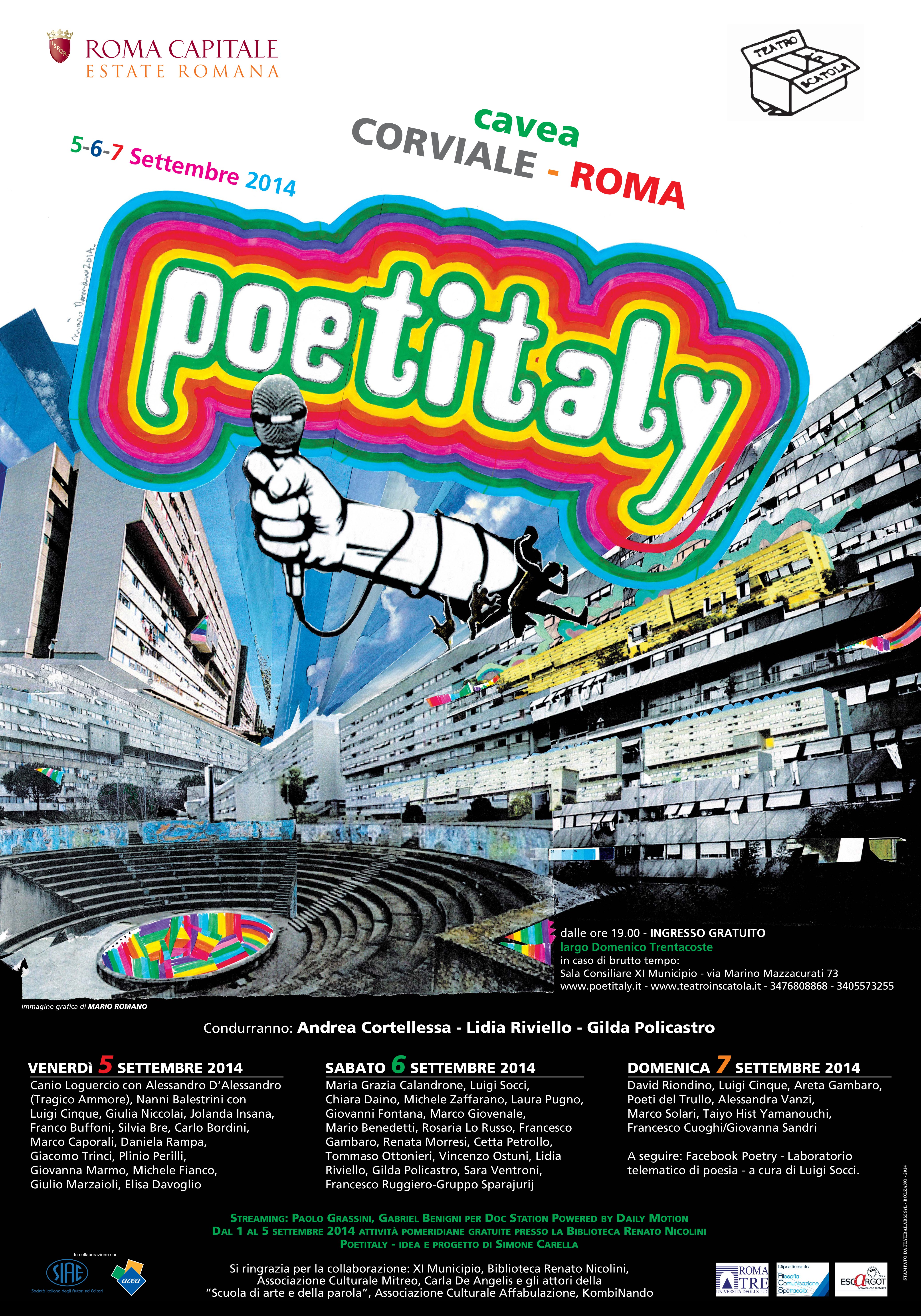 Inserita nella programmazione ESTATE ROMANA 2014, la manifestazione POETITALY A CORVIALE è realizzata con il sostegno di Roma Capitale in collaborazione con Acea, Siae e la Biblioteca Renato Nicolini – Biblioteche di Roma.