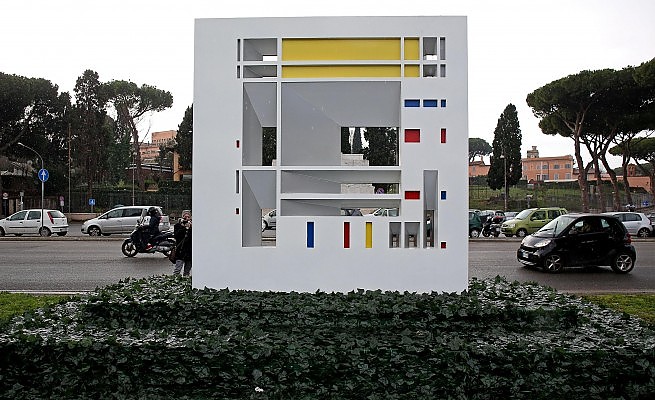 Al di là dell’impertinenza dell’operazione, constato che il nostro operatore culturale ha realizzato un’opera di modernariato linguistico costringendo Mondrian a vivere all’aperto tra le intemperie della stagione invernale e lo smog del traffico. Ma il Situazionismo operava su una strategia di confronto eclatante, capace di suscitare reazioni e riflessioni. Perché nel nostro caso questo non è avvenuto? Nessuno tra cittadini e turisti ha reagito o si è posto il problema se l’installazione costituisse un’opera di arte pubblica autorizzata dal Comune. La risposta, sul piano culturale, è semplice. Prevalgono la silenziosa occupazione di suolo pubblico e l’appropriazione indebita di un bene collettivo (il paesaggio urbano e archeologico) in quanto l’opera non ha la forza di stabilire un confronto e si adatta, con buona educazione geometrica, a coabitare in silenzio con la mitezza di un clochard. Comunque, non drammatizziamo con una severità postuma. Piuttosto, vigiliamo con più attenzione su una città che è un museo a cielo aperto.